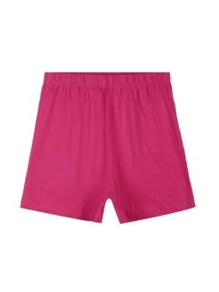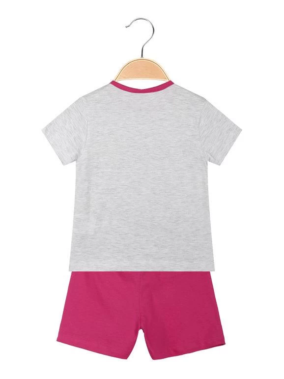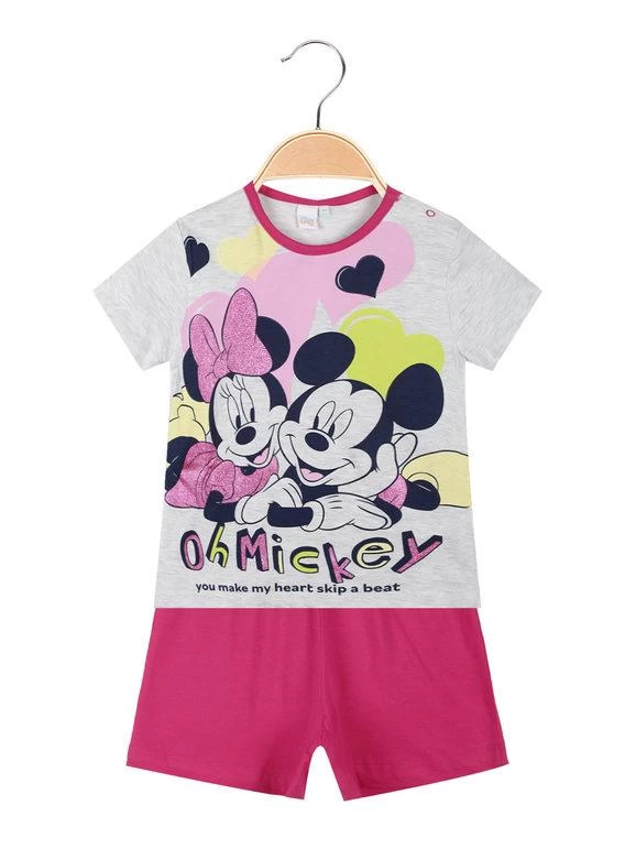 Pigiama corto da neonata in cotone, composto da: t-shirt girocollo con stampa Minnie, bottoncini a clip sulla spalla; shorts tinta unita con elastico in vita. Confezionato in scatola