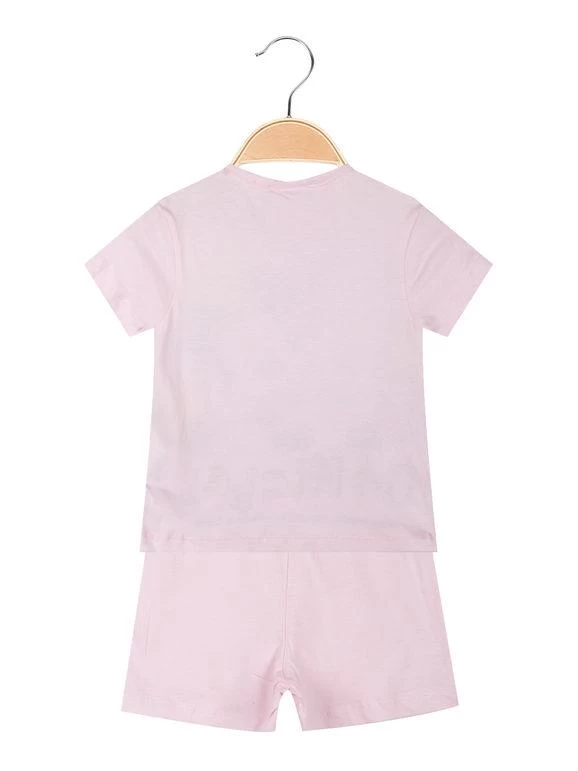 Pigiama corto da neonata in cotone, composto da: t-shirt girocollo con stampa Minnie, bottoncini a clip sulla spalla; shorts tinta unita con elastico in vita. Confezionato in scatola