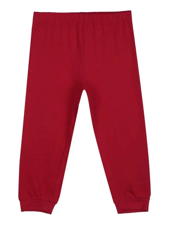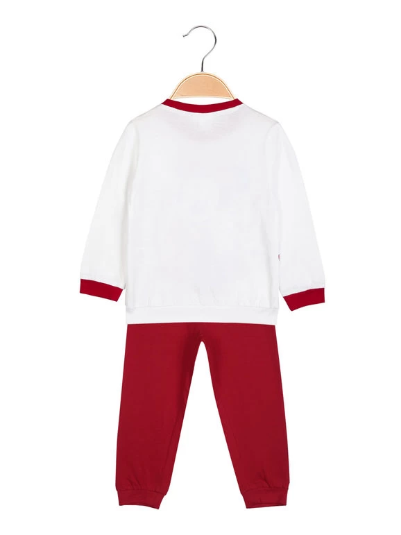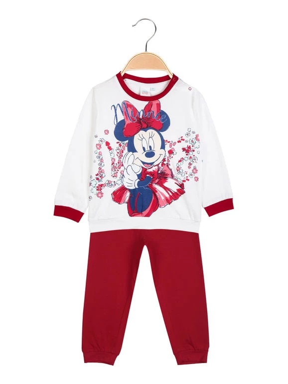 Pigiama lungo da neonata in cotone, composto da: t-shirt manica lunga, scollo tondo, bottoncini a clip sulla spalla, polsini e bordo finale elasticizzati in contrasto colore, stampa disegno Minnie sul fronte; pantaloni in tinta unita, elastico in vita, polsini elasticizzati sul finale.