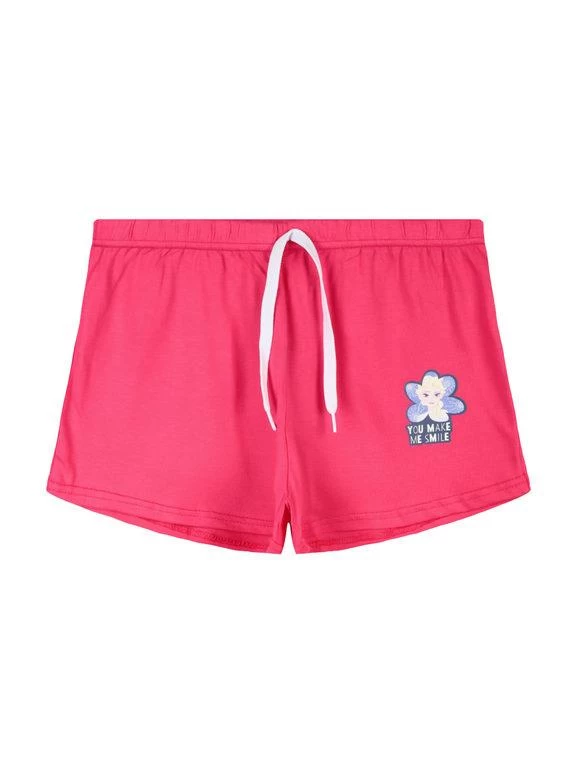 Shorts da bambina in cotone tinta unita, elastico in vita con laccetti per fiocco, stampa Elsa sul fondo.