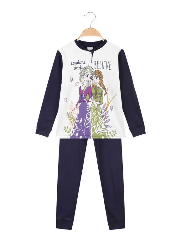 Pigiama da bambina in cotone felpato, composto da: maglietta a maniche lunghe con polsini, bottoncini sullo scollo, stampa su fronte, interno in cotone felpato; pantaloni in tinta unita, elastico in vita, polsini sul finale, interno in cotone felpato.