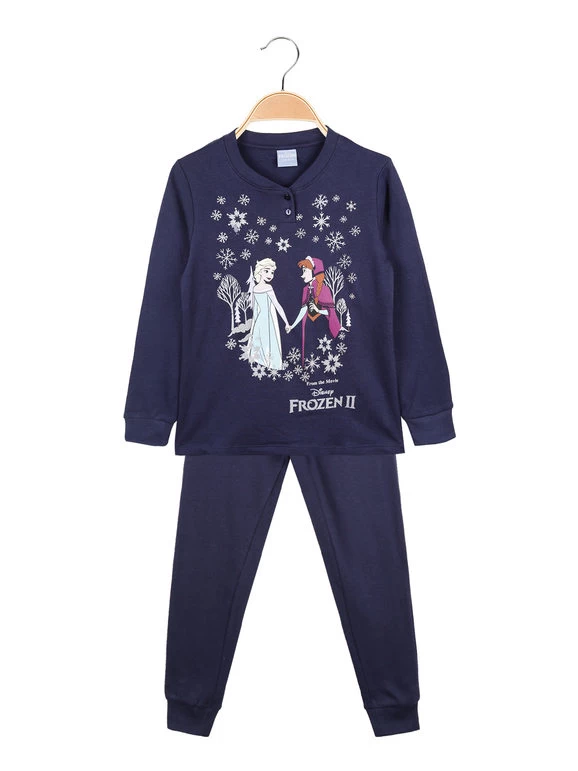 Pigiama lungo da bambina in caldo cotone, composto da: t-shirt manica lunga, scollo tondo con bottoncini, polsini elasticizzati, stampa disegno Elsa e Anna sul fronte; pantaloni in tinta unita, elastico in vita, polsini elasticizzati sul finale.