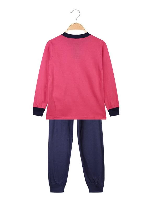 Pigiama lungo in cotone composto da: maglietta a maniche lunghe, scollo tondo con bottonicini, stampa disegno sul davanti; pantaloni tinta unita, con elastico in vita, polsini sul finale