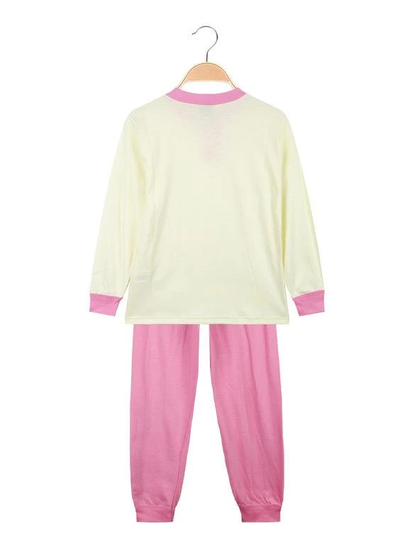 Pigiama lungo in cotone composto da: maglietta a maniche lunghe, scollo tondo con bottonicini, stampa disegno sul davanti; pantaloni tinta unita, con elastico in vita, polsini sul finale